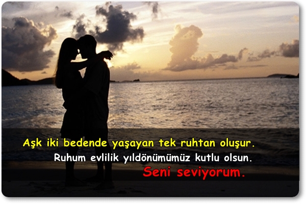 Aşk iki bedende yaşayan tek ruhtan oluşur. Ruhum evlilik yoldönümümüz kutlu olsun. Ellerimiz birbirine daha da sıkı sarılarak hiç ayrılmasın.