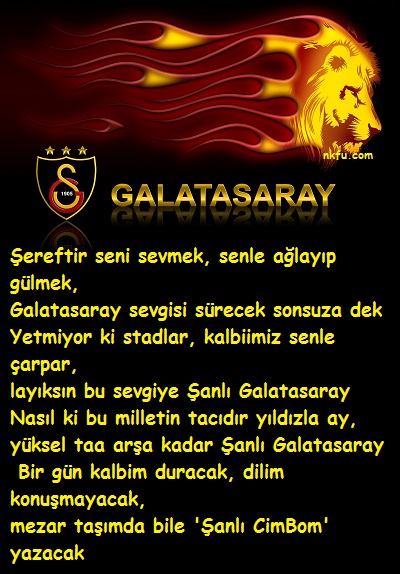 ilk aşkım ,en büyük tutkum ,ölümüne sevdiğim terk etmeyi asla düşünmediğim.. tek kötü söz ettirmediğim.. sarı kırmızıdan başka renk bilmediğim… ”GALATASARAYDAN” vazgeçmediğim… Büyük bir tutkumsun benim..