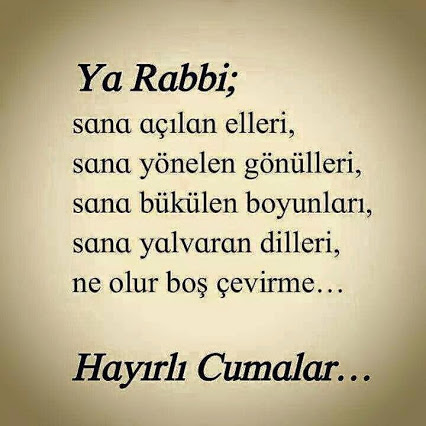 –Ya Rabbi; sana açılan elleri, sana yönelen gönülleri, sana bükülen boyunları, sana yalvaran dilleri, ne olur boş çevirme. Hayırlı cumalar.
