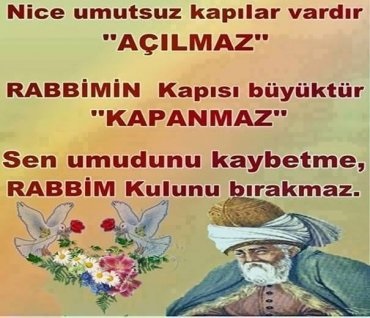 Rabbim, kalbim’e değen sızıları ince, ince söz eyle,Yüzüme değen gözyaşları’ma Rahmet eyle. -Hz. Mevlana