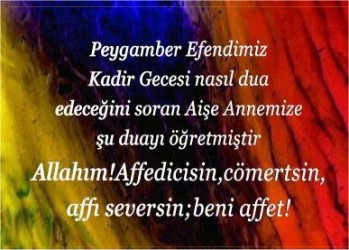 Borçlarımızdan, ceza ve günahlarımızdan kurtulmak için bu gece dua edelim.. Allah affeden ve bağışlayandır, unutmayalım.. Eller semaya kalkıp, yürekler bir atınca bu gece, gözler sevinç yaşlarıyla dolacak.. kadir geceniz mübarek, dualarınız kabul olsun…