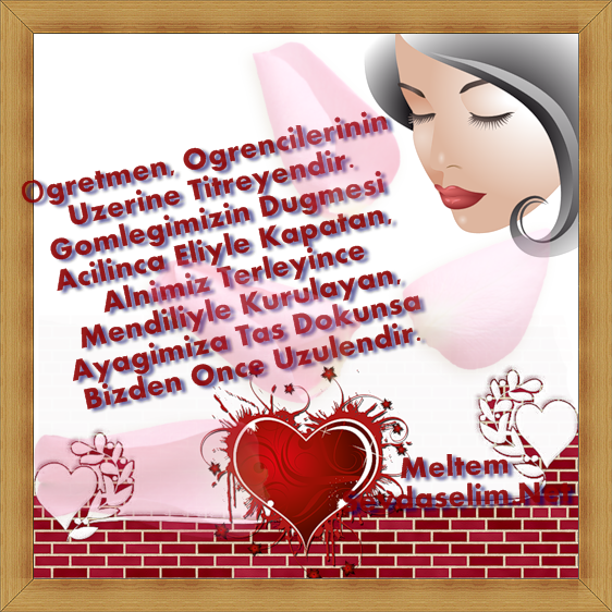 Sen bizleri bu vatan için yetiştiren, en zor anlarımızda bizlere yardım eli uzatan, yeri geldiğinde bir arkadaş gibi sır tutan canım öğretmenim. Seni çok seviyorum